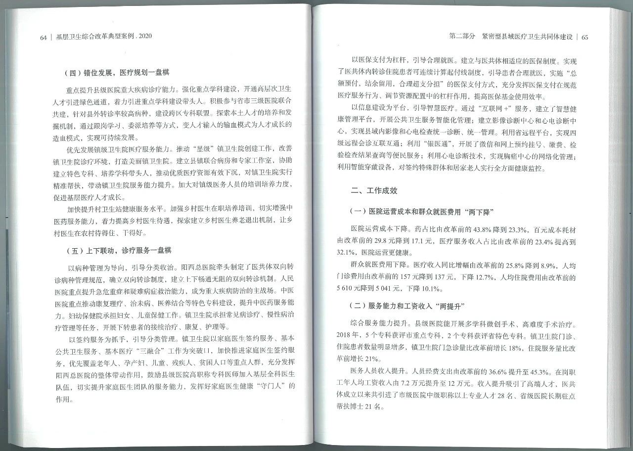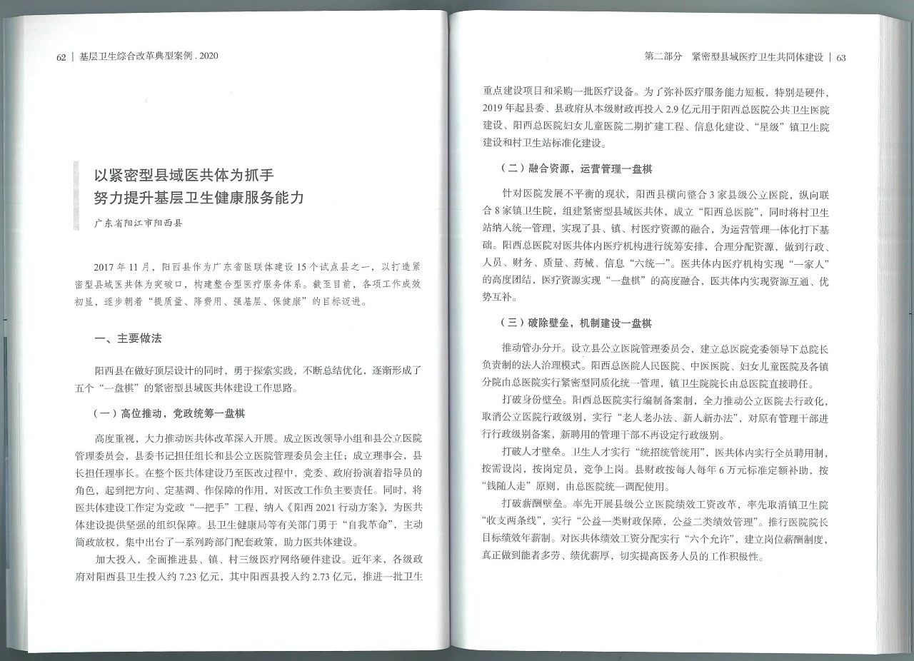 近日,由国家卫生健康委员会基层卫生健康司、国家卫生健康委卫生发展研究中心组织编写的《基层卫生综合改革典型案例2020》一书,收入广东省阳西县域医共体《以紧密型县域医共体为抓手努力提升基层卫生健康服务能力》一文。详细介绍了阳西县自2017年11月启动县域医共体建设以来,着力补短板,建机制,强基层,努力构建以人为本的整合型医疗卫生服务体系的创新做法及取得的阶段性成效。