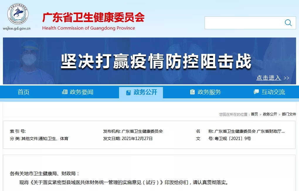 近日,广东省卫生健康委联合省财政厅、省中医药局印发《关于落实紧密型县域医共体财务统一管理的实施意见(试行)》的通知,进一步推动县域医共体平稳运行和健康发展。