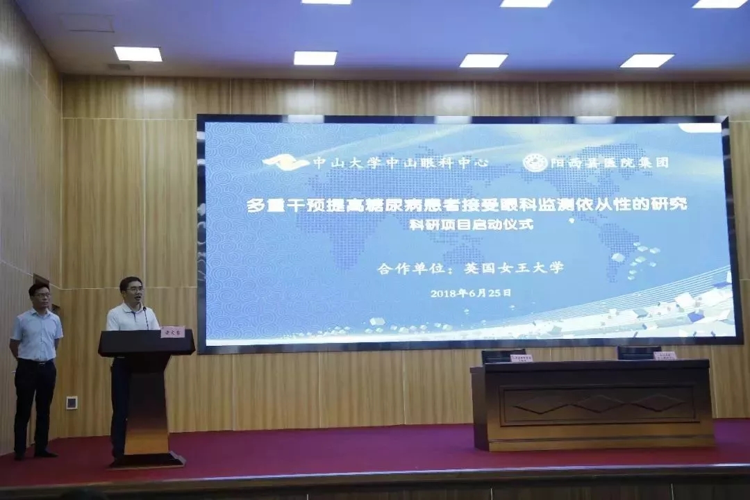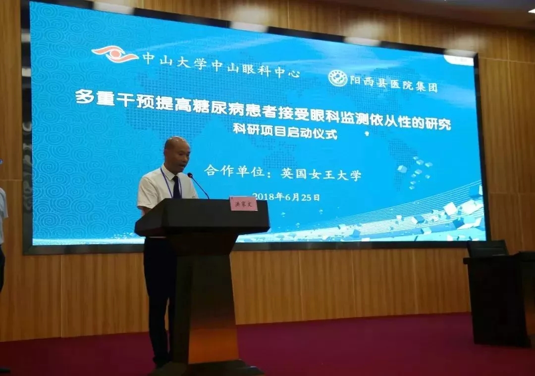 2018年6月25日,阳西县医院集团 中山大学中山眼科中心多重干预提高糖尿病患者接受眼科监测依从性的研究眼科科研项目启动仪式在阳西县医院集团员工活动中心举行。全国防盲技术指导组副组长、中山大学中山眼科中心黄文勇教授,县电子政务办刘丽萍主任出席启动仪式并致辞。中山大学中山眼科中心王聪尧博士、县医院集团各成员单位班子成员及各分院院长,县医院集团总医院相关职能科室、临床科室主任、护长和业务骨干共约60余人参加了启动仪式。仪式由县卫计局赖若鸿副局长主持。