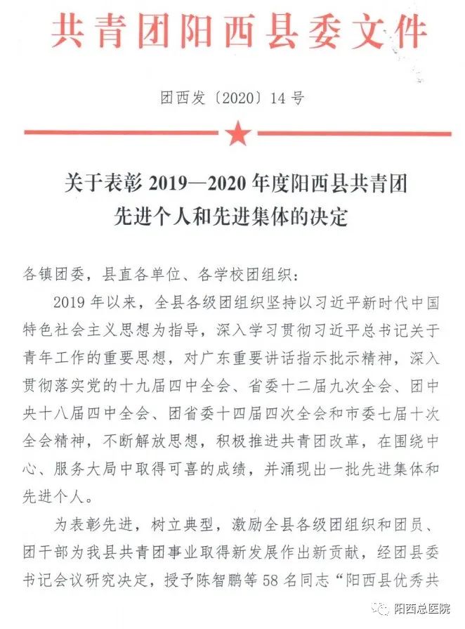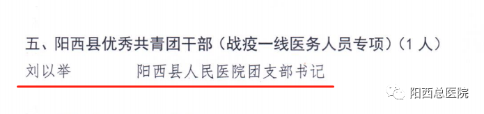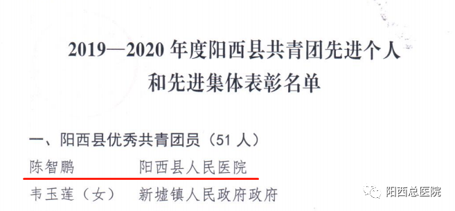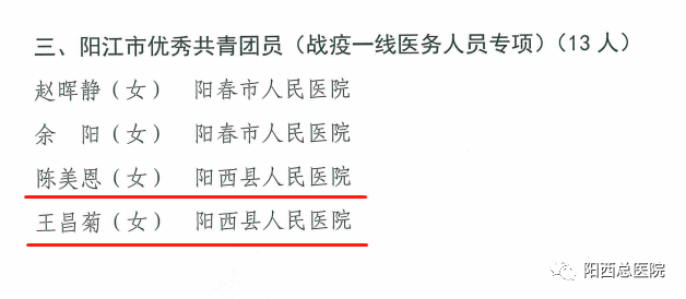 近日,为传承和弘扬“五四”青年的先锋精神,共青团阳江市委发文表彰了“2019—2020 年度阳江市共青团先进个人和先进集体”,总医院院感染内科护士王昌菊、急诊科护士陈美恩获得“2019-2020年度阳江市优秀共青团员”称号。同时,共青团阳西县委发文表彰了“2019-2020年度阳西县共青团先进个人和先进集体”,总医院人民医院团支部书记刘以举获得“2019-2020年度阳西县优秀共青团干部”称号;总医院人民医院五官科医师陈智鹏、儿科医师陈观掌、急诊科护师刘昌霞、儿科护士赖玉珊、感染科护士殷瑞霞,阳西总医院新圩分院李飘飘获得“2019-2020年度阳西县优秀共青团员”称号。
