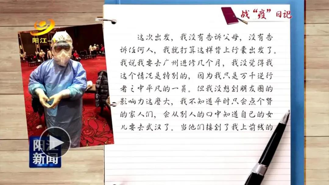 我市首批驰援湖北的医疗队中,有这样一位逆行勇者,为了不让家人担心牵挂,她起初瞒着父母毅然选择出征。她就是来自阳西总医院护士姚艳萍,一位自称护理老兵的90后。今天来看记者与她的连线。