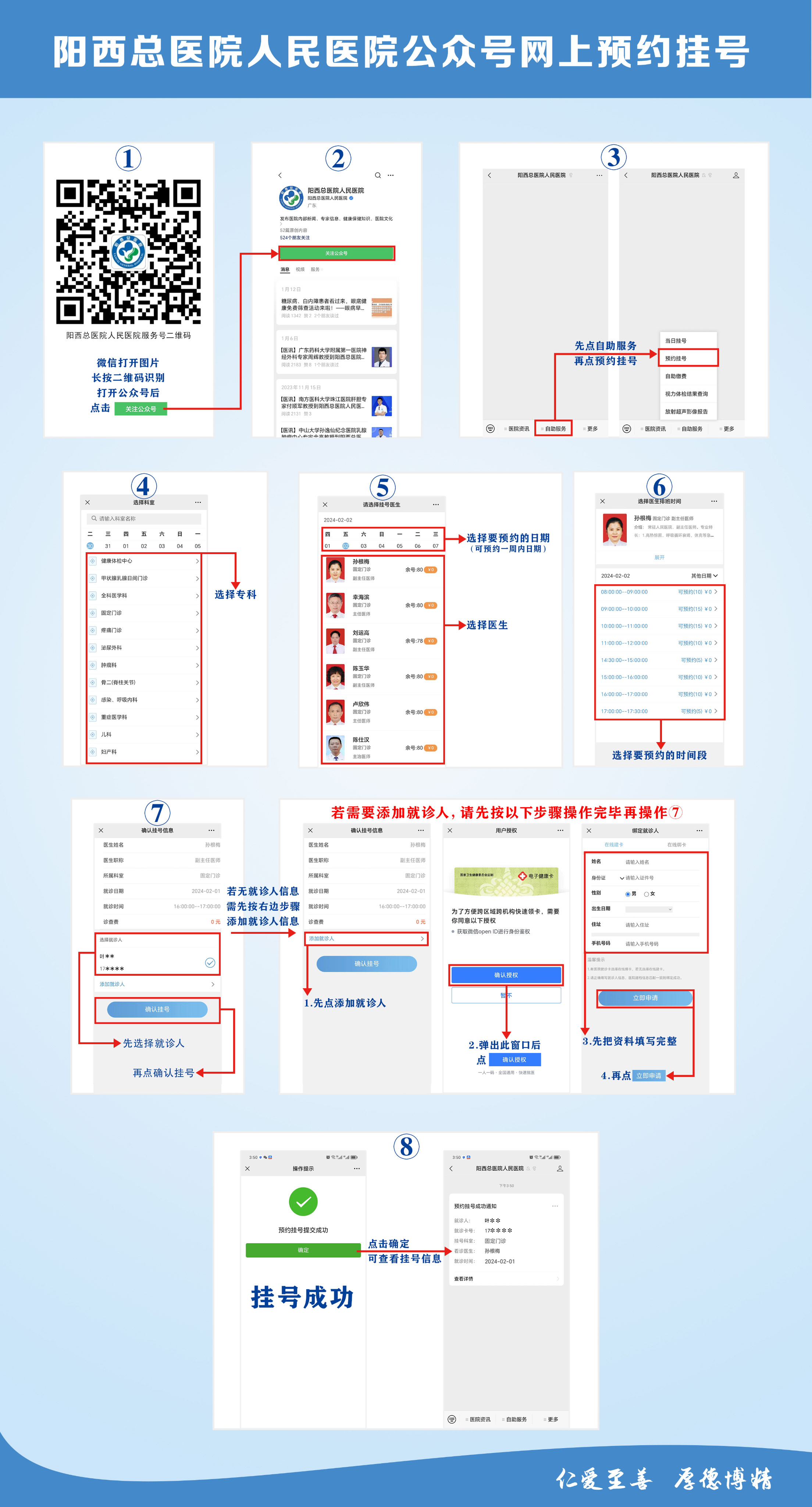 请扫码关注阳西总医院人民医院微信公众号,进行当日挂号或预约挂号。
