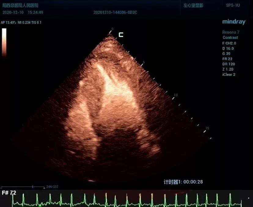 12月10日,一位70岁男性患者,因反复劳力性胸闷痛7天入院。经了解既往无高血压、糖尿病史。心电图检查发现患者胸前导联ST段下移,T波深倒,提示心肌缺血,冠脉造影未见异常,行常规心超考虑“心尖肥厚型心肌病”。因心内膜边界欠清晰,为进一步佐证临床医师的诊断,韦教授建议行左心声学造影。造影结果心肌明显增厚,心尖部呈“核桃尖”样改变,心腔接近闭塞,造影检查不仅准确测量得出心肌厚度,同时发现常规心超检查没有发现的小室壁瘤。最终诊断“心尖肥厚型心肌病并室壁瘤形成”,这一诊断为临床治疗和预后评估提供非常重要的信息。