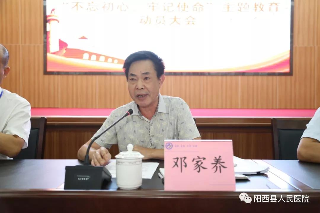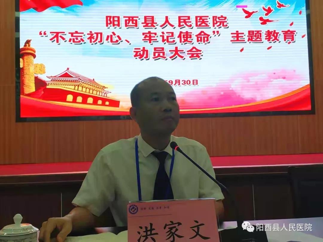 9月30日,阳西县人民医院党委召开“不忘初心、牢记使命”主题教育工作会议。会议深入学习习近平总书记重要讲话精神,认真贯彻落实中央和省委、市委、县委关于主题教育各项部署要求和有关文件精神,动员部署我院开展“不忘初心、牢记使命”主题教育工作。党委书记吴达党同志作动员讲话,县委第五巡回指导组副组长邓家养同志作指导讲话,党委副书记廖业敏同志主持会议,阳西总医院总院长洪家文出席会议。