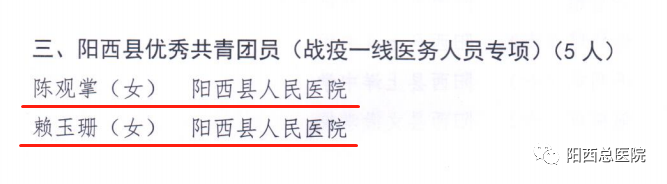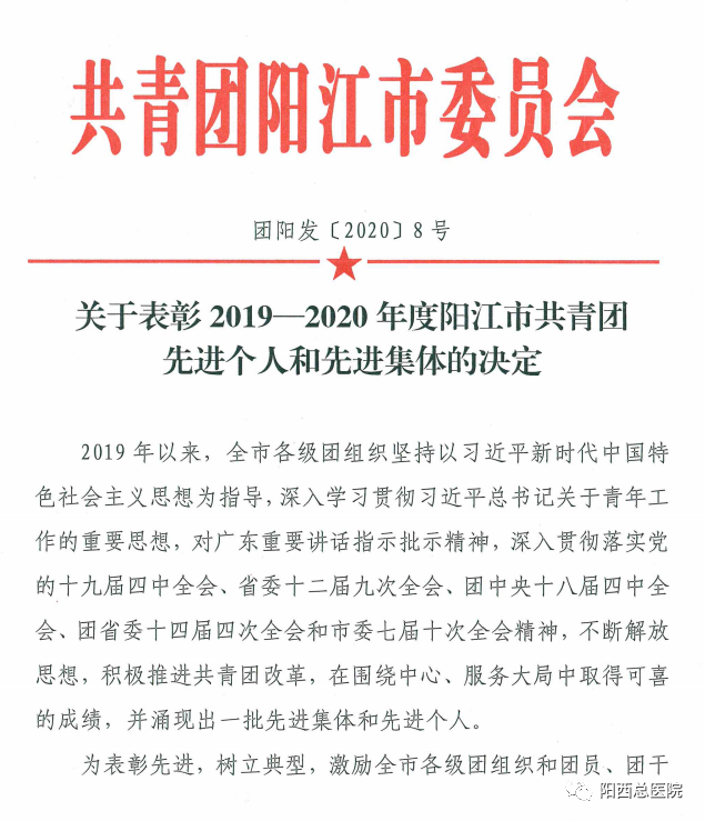 近日,为传承和弘扬“五四”青年的先锋精神,共青团阳江市委发文表彰了“2019—2020 年度阳江市共青团先进个人和先进集体”,总医院院感染内科护士王昌菊、急诊科护士陈美恩获得“2019-2020年度阳江市优秀共青团员”称号。同时,共青团阳西县委发文表彰了“2019-2020年度阳西县共青团先进个人和先进集体”,总医院人民医院团支部书记刘以举获得“2019-2020年度阳西县优秀共青团干部”称号;总医院人民医院五官科医师陈智鹏、儿科医师陈观掌、急诊科护师刘昌霞、儿科护士赖玉珊、感染科护士殷瑞霞,阳西总医院新圩分院李飘飘获得“2019-2020年度阳西县优秀共青团员”称号。