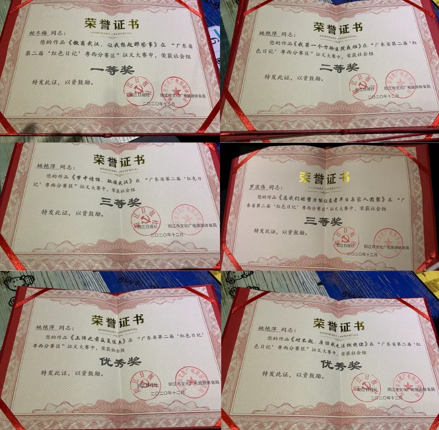 红色基因是一种革命精神的传承,广东省文化学会牵头在全省举办第二届“体育彩票·红色日记”征文大赛,除广州、珠三角等城市外,还在粤东、西、北设分赛区。稿件主题有红色景点游记、红色作品观感、扶贫攻坚事迹、抗疫战疫日记等。参赛者们根据自己对中华民族红色精神的真切体会和认识用文字呈现出奉献群众、艰苦拼搏为代表的时代精神。阳西总医院三位抗疫勇士,凭着自己亲身驰赴武汉方舱医院过程中的白衣执甲、大医情怀真切体会,撰写出一篇篇感人的日记,分别取得优异成绩。其中赖冬梅一篇《撤离武汉,让我想起那些事》获得一等奖;姚艳萍《我第一个方舱医院夜班》《梦中请缨,驰援武汉》分别获得二、三等奖;罗浓伟一篇《愿我们的努力能让患者早日和家人团聚》获得三等奖,他们另有几篇获得优秀奖。